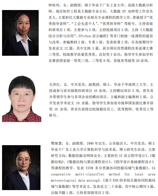 大数据专业于我校2018年开始招生,大数据工作室成立于2019年,工作室负责人钟桂凤,团队成员包括钟桂凤副教授、毛养红副教授等专业教师。近两年,团队教师积极带领学生参加各类大数据比赛事项、展校企协同、产学研相结合的教学模式的探索,师生团队在教学科研等多个方面都取得了较好的成绩,科研方面工作室获授权专利5项(发明型1项),软件著作权3项,发表论文10多篇、核心6篇,参编教材2部;主编专著1部,主持教学科研项目9项。工作室学生团队参加大学生创新创业项目4项,在学科竞赛上获得国家级奖项6项、省级15项。主要涵盖在“蓝桥杯”、“中国高校大数据挑战赛”、 “数学建模竞赛”、“广东省大学生计算机设计大赛”等比赛项事上。指导18级大数据班6名同学获得了由国家工业和信息化部颁发的初级职称大数据分析工程师证书,指导19级大数据班学生获系统集成项目管理工程师中级证书。