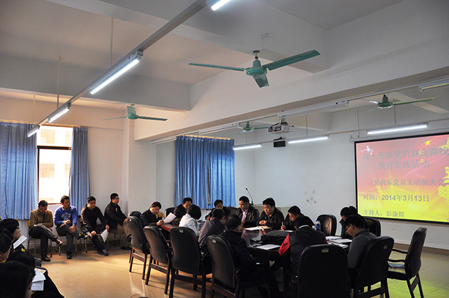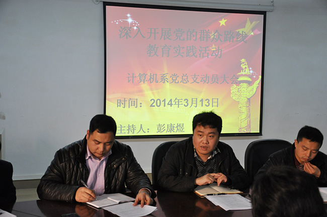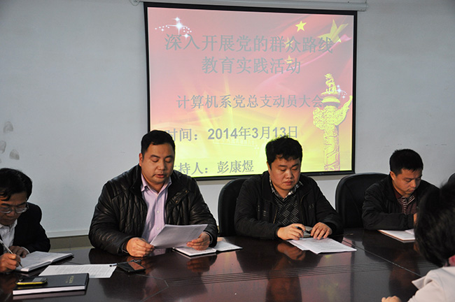 2014年3月13日,根据学院党委的统一部署与要求,计算机科学与技术系党总支召开了党的群众路线教育实践活动动员大会。会议由计算机系党总支书记彭康煜主持,计算机系全体教师参加,并邀请了党群工作部副部长陈朝阳同志到会指导。