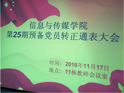2016年11月17日,信息与传媒学院学生党支部在11栋教师会议室召开第25期预备党员转正通表大会,会议由院学生党支部统战委员阮嘉欣主持,出席本次会议的有信息与传媒学院学生党支部书记何祉谕以及学生党员。