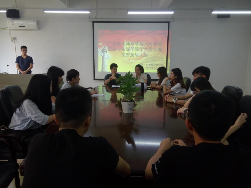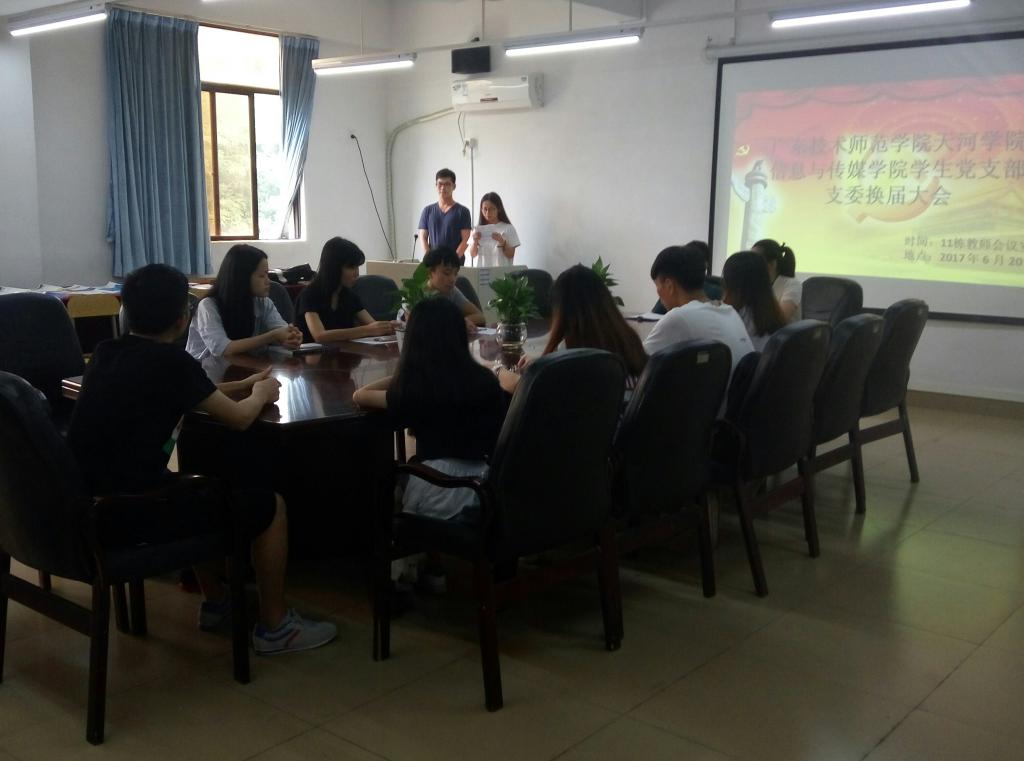 2017年6月20日,学生党支部在11栋教师会议室召开支部委员换届会议,会议由陈健主持,出席本次会议的成员有学生党支部书记何祉谕、学生党支部专职学生党务干事黄鸿鑫老师及全体学生党员。