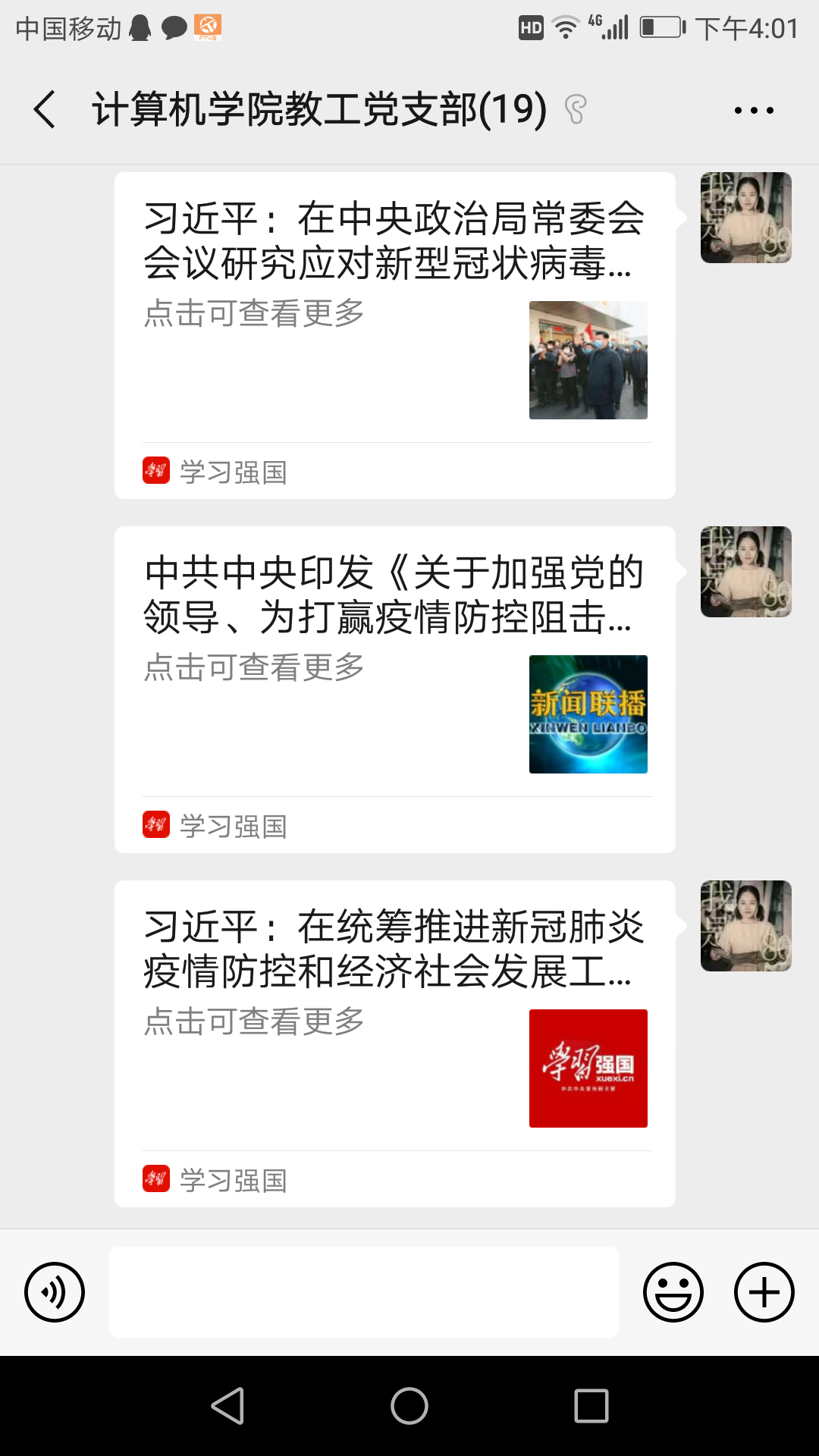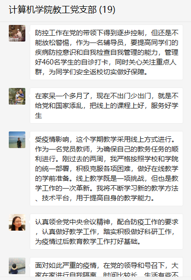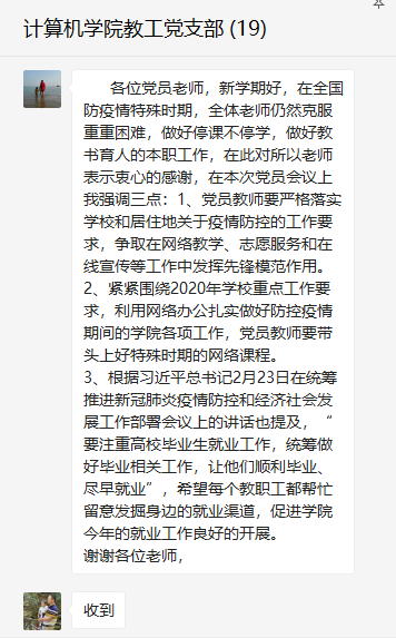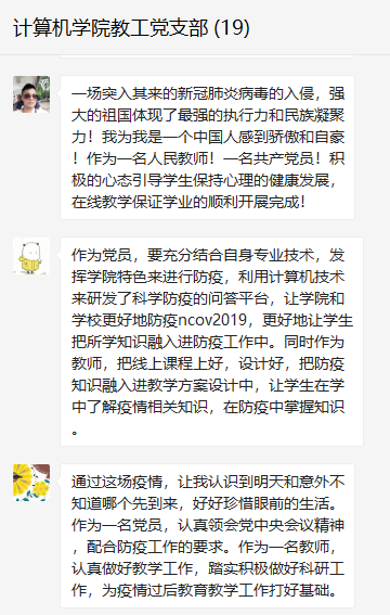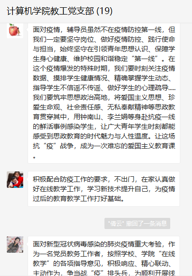 在线学习结束后,全体党员在群里交流学习体会。大家表示,作为个人要配合防疫工作要求,作为教师要做好教学科研工作,作为辅导员要管理服务好学生,上下联动,为打赢疫情防控提供坚强政治保证。