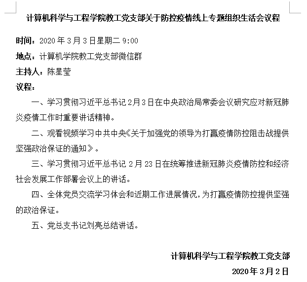 3月3日上午,williamhill英国官网教工党支部利用微信群在线召开了防控疫情专题组织生活会。会议由教工党支部副书记陈星莹主持。