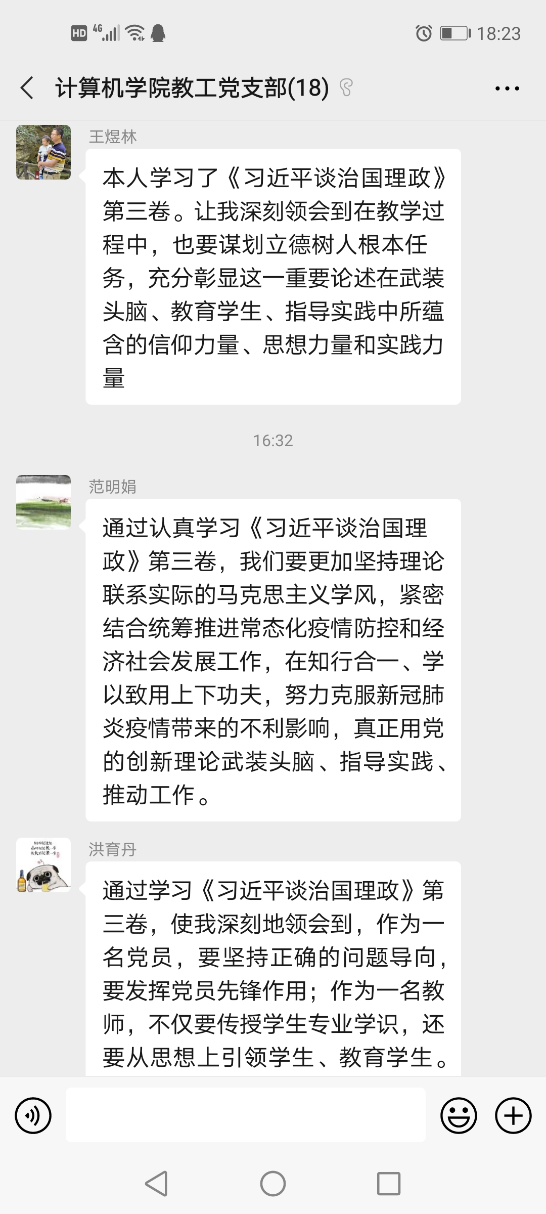 本次专题学习分两个阶段,第一阶段是前期的个人自学,第二阶段是学习会上全体党员围绕学习主题开展交流。《习近平谈治国理政》第三卷是在前两卷的基础上,进一步集中展示党的十九大以来,马克思主义中国化的最新成果,是全面系统学习习近平新时代中国特色社会主义思想的重要文献,是习近平总书记在领导推进新时代治国理政的实践中,所发表一系列重要论述和提出的那些具有原创性、时代性、指导性的重大思想观点。根据支部部署,williamhill英国官网全体教工党员利用暑假期间读原著、听音频等,开展形式多样的自学活动,再结合当前疫情防控工作、教工党员自身的本职工作,进一步深入领会习近平新时代中国特色社会主义思想。