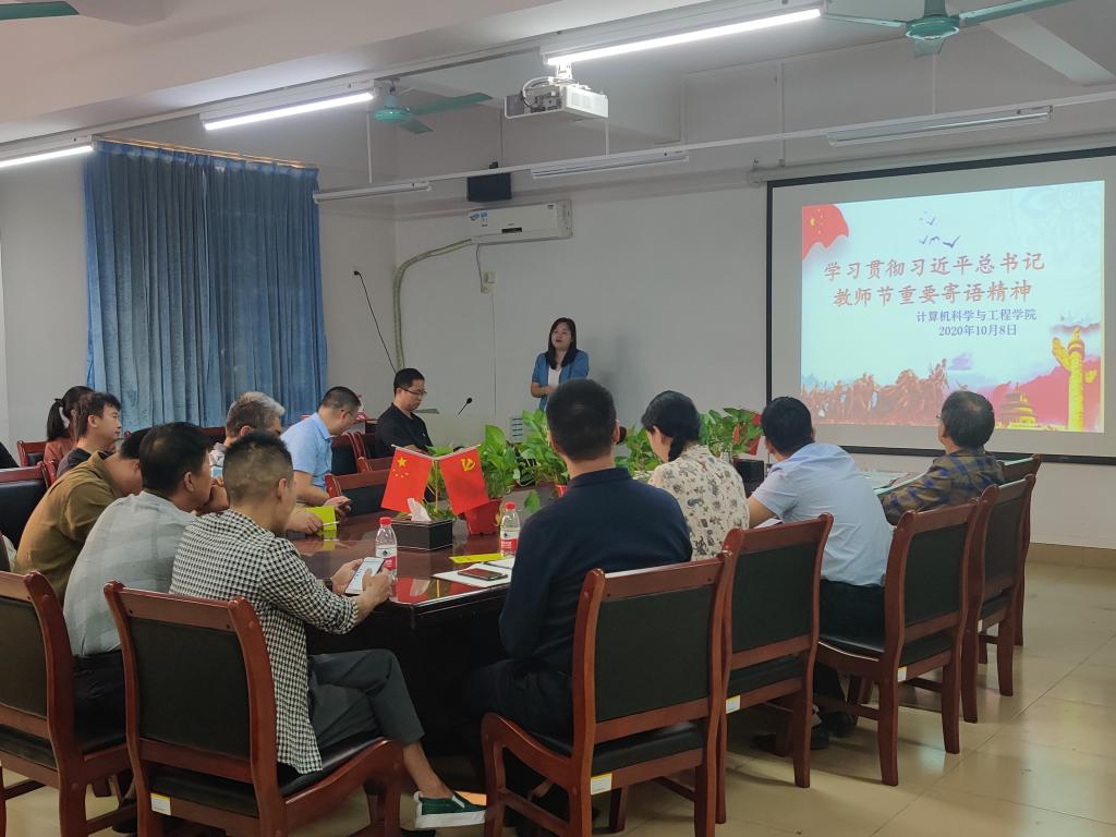 (通讯员:陈星莹)10月8日下午,计算机学院组织全体教师学习了习总书记教师节重要寄语精神,号召全体教职工要不忘立德树人初心,牢记为党育人为国育才使命,在各自岗位上努力作出新的更大贡献。会议由计算机学院教工党支部副书记陈星莹主持,学院领导和全体教师共40多人参加了本次学习会。会上,全体教职工一起学习了习近平总书记教师节的重要寄语具体内容,并结合各自工作岗位实际去谈认识和体会。最后,原峰山院长做了总结发言,鼓励全体教师要弘扬伟大的抗疫精神,不忘立德树人初心,争取把学院今年工作再推上新台阶。
