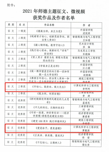 (通讯员:马祺峰)12月1日,学校人事处公布了“赓续百年初心,担当育人使命”师德主题征文及微视频征集评选活动获奖情况,williamhill英国官网报送的两篇征文《守初心,践使命,做大先生》与《爱是给予,爱是温暖》脱颖而出,分别荣获三等奖与优秀奖,微视频《布最广的网,育最优的人》荣获优秀奖。