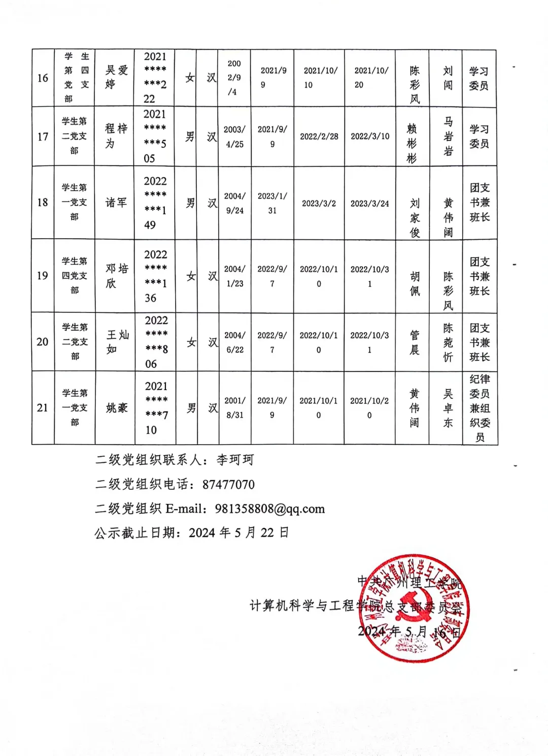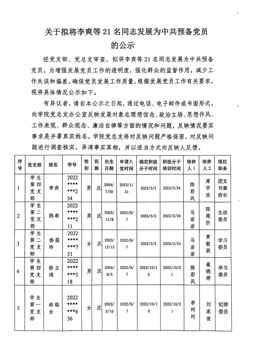 经党支部、党总支审查,拟将李爽等21名同志发展为中共预备党员。为增强发展党员工作的透明度,强化群众的监督作用,减少工作失误和偏差,确保党员发展工作质量,根据发展党员工作有关要求,现将具体情况公示如下。