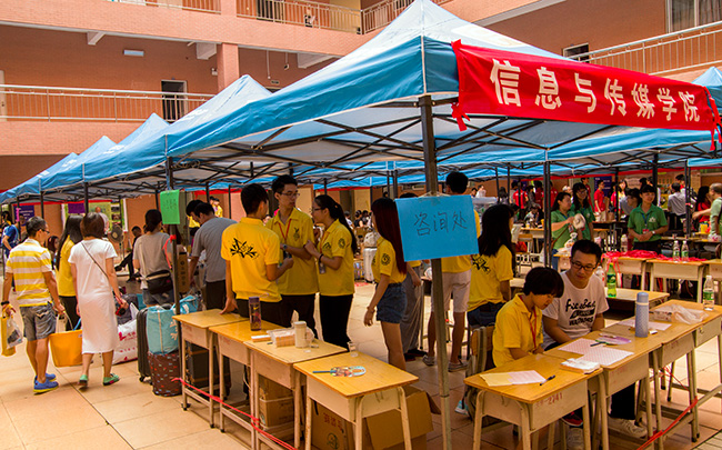 迎新工作如火如荼地进行着,到处都是忙碌的身影。信息与传媒学院的志愿者们积极地为新生和家长解答各种问题,主动帮着新生们拎行李,一路有说有笑。
