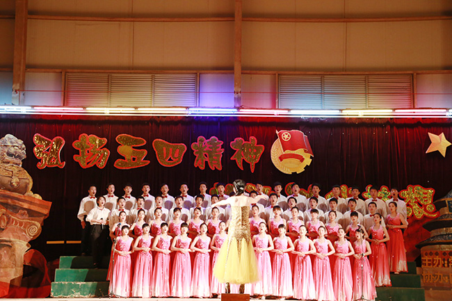 “五星红旗,你是我的骄傲。五星红旗,我为你自豪……”一段段激情昂扬的旋律,一句句动人心魄的歌词,飘荡在体育馆,环绕在我们的耳际,在场的观众深深地为你们的歌声所动容。“红旗飘呀飘 红旗飘呀飘 腾空的志愿像白云越飞越高……”一抹玫红映在身穿洁白色衬衫的男生上,裙摆随着肢体的左右摆动自然地飘动,指挥员身上的金灿灿,一闪一闪地晃动在玫红上,远远望去,彷如一面五星闪烁的红旗在白云中飘扬,完美地结合歌词,与舞台的帷幕相得益彰,恰好地点缀舞台,形成了一幅美妙的画面。 他们专注的眼神,让我们渐渐地深入歌曲中;他们整齐的姿态,让我们竖起认真的态度去聆听;他们一致的口型,让我们不自主地轻声歌唱。指挥员激情盎然的指挥,透过眼睛把五四的激昂斗志传递到我们的心灵。最后,他们一齐展开手臂,放飞梦想,阵阵掌声响起,欢呼声与呐喊声伴随着灯光的渐渐暗淡,身影的渐渐模糊而消失。