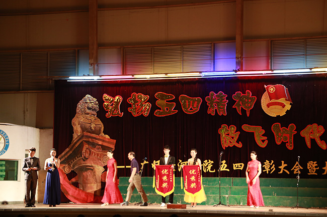 2014年04月29日晚19:30,广东技术师范学院天河学院“弘扬五四精神,放飞时代梦想”五四表彰暨大合唱比赛在体育馆隆重举行。学院领导以及八个教学系部共同欣赏了一场红色盛典。 大会对这一年来的团工作进行了总结表彰,学院领导为获得优秀团员、优秀团干、优秀团支部的代表进行颁奖后,一曲曲“红旗飘飘”在校园里激情回荡。激动人心的时刻紧紧相扣在第七个节目,计算机科学与技术系的队伍隆重登场。一位位穿着玫红色长裙的女生以端庄优雅的步姿徐徐入场,身穿金黄色礼服的女指挥员优雅地走向指挥台,弯曲她的纤腰,向学院领导以及八个教学系部表示她的敬意;挥动她的指挥棒,向队伍宣告合唱的开始。