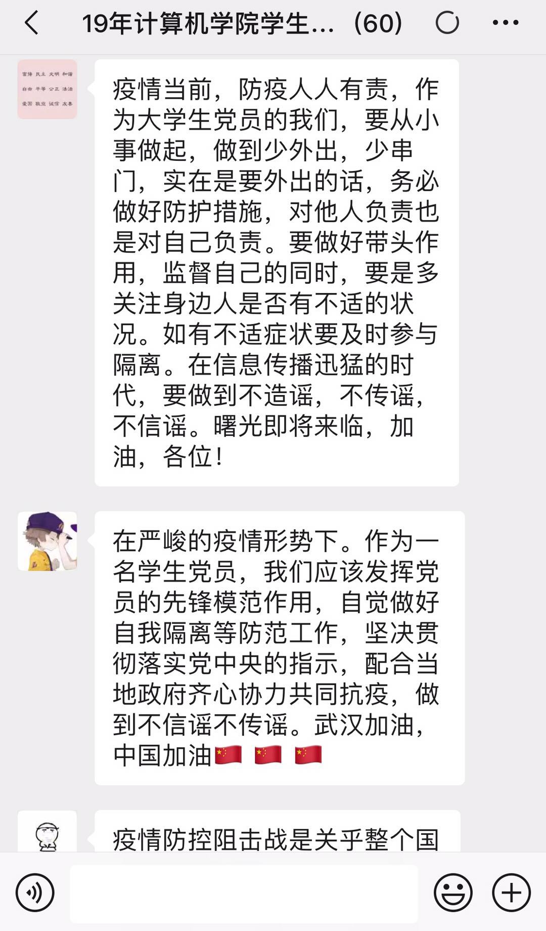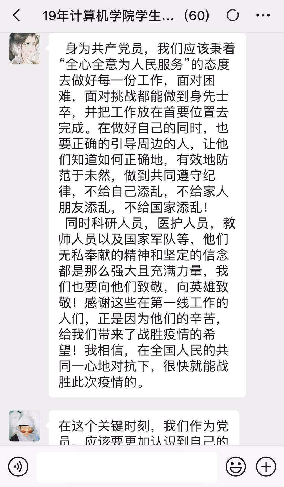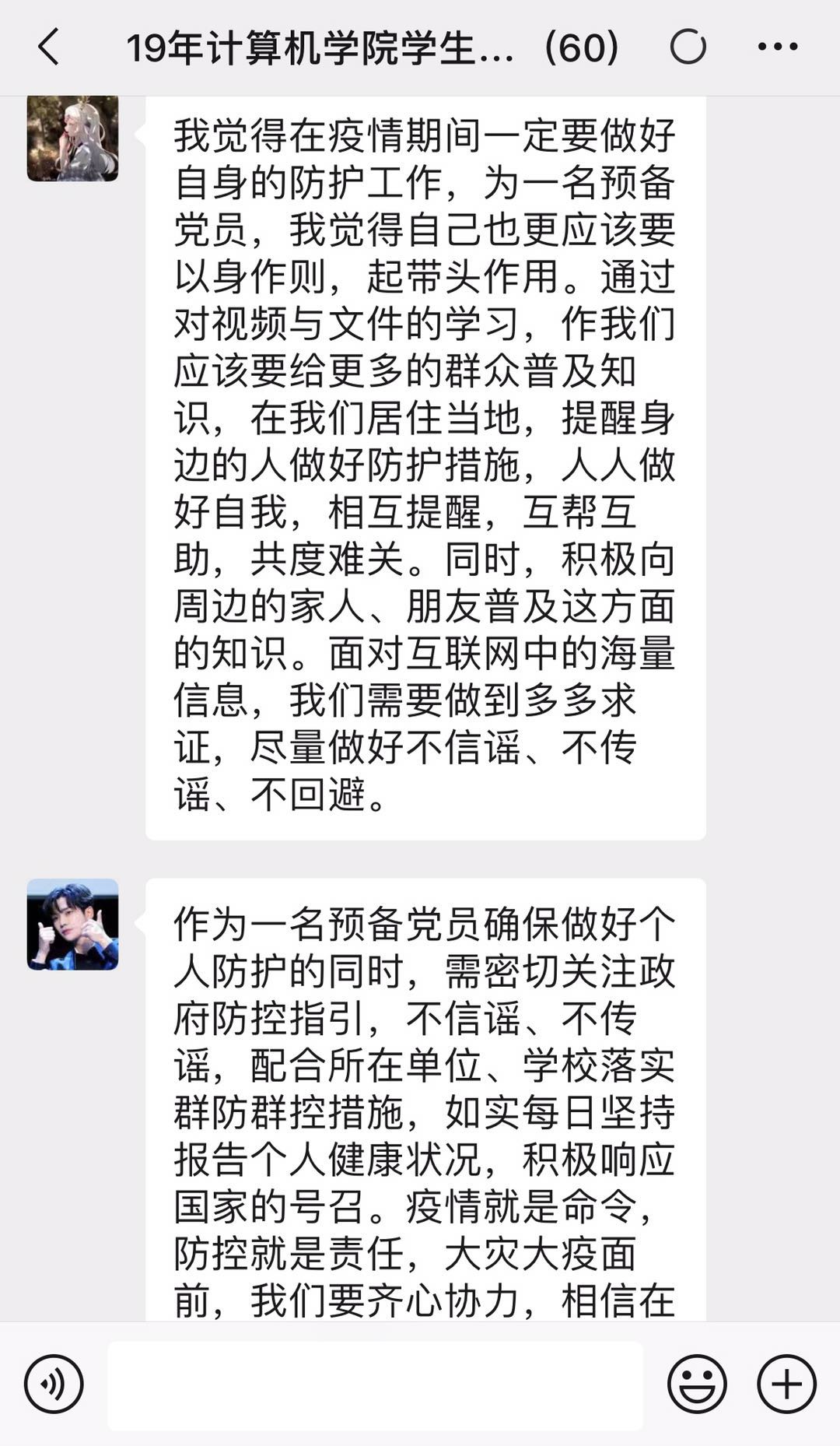 预备党员彭嘉伟说:“新型冠状病毒的突然出现让我们措手不及,从武汉为中心,疫情逐渐向全国扩散,全民抗疫刻不容缓。在这次疫情面前,我看到我们国家在共产党的引导下,迅速有效地开展疫情防护救治工作,我看到了我们共产党在危难中所展现出来的强大力量。而作为一名预备党员,我觉得自己也更应该要以身作则,起带头作用。在生活中,应该加强自我防护意识,保持个人清洁卫生;在思想上,要不信谣不造谣不传谣,要相信国家相信党;在行动上,要结合自身能力积极参与抗疫志愿活动,用实际行动为疫情贡献自己的一份力量。最后,我要向那些奋战一线的工作者们致敬,向那些所有为疫情奉献自己的平凡天使们学习,因为有你们,我们才有希望,谢谢你们,你们辛苦了。”