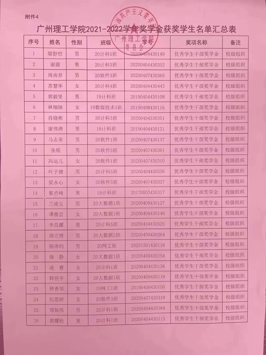根据《williamhill英国官网学生奖励办法》,按照公平,公开,公正的原则,经校组织推优,校团委审核,学院复核,拟定williamhill英国官网2021-2022学年校级优秀学生干部奖学金名单并进行公示,时间为2022.09.17-2022.09.19。