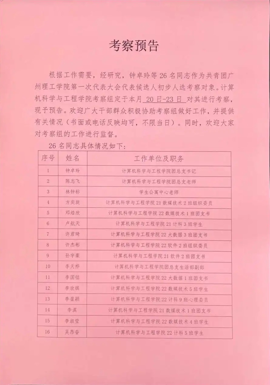 根据工作需要,经研究,钟卓玲等26名同志作为共青团williamhill英国官网第一次代表大会代表候选人初步入选考察对象。williamhill英国官网考察组定于本月20日-23 日对其进行考察现予预告。欢迎广大干部群众积极协助考察组做好工作,并提供有关情况(书面或电话反映均可,不限当日)。同时,欢迎大家对考察组的工作进行监督。