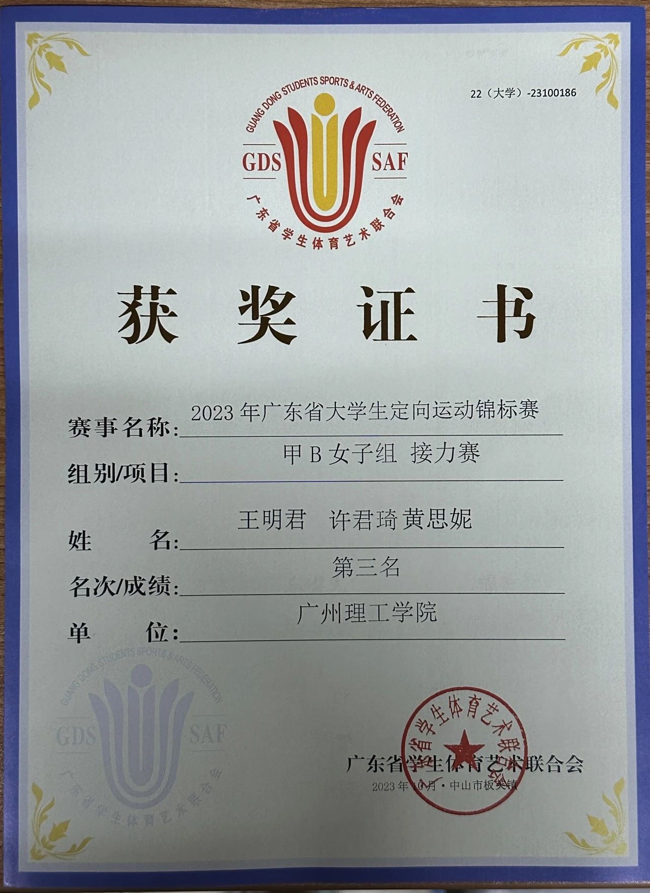 (通讯员:席宇欣)在这个阳光明媚的金秋,2023年广东省大学生定向运动锦标赛于10月27至29日在中山市板芙镇举行。williamhill英国官网22大数据3班许君琦、22计科9班甘镇东、22大数据3班吴晓森、22数媒技术3班蔡传权参与本次赛事,凭着自我的坚强意志和顽强拼搏的勇气,最终许君琦同学协队友王明君、黄思妮获得甲B女子组接力赛第三名的好成绩。