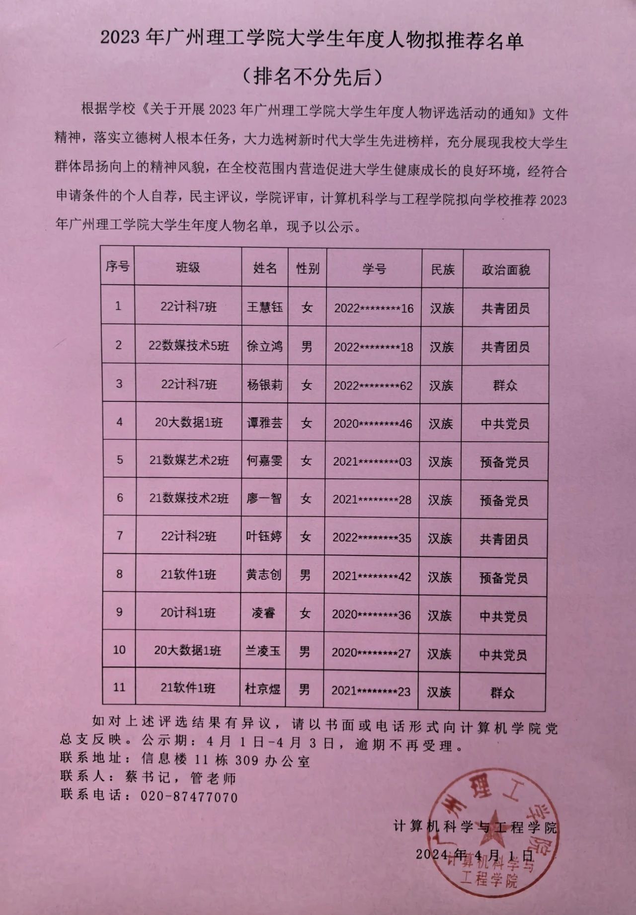 如对上述评选结果有异议,请以书面或电话形式向计算机学院党总支反映。公示期:4月1日-4月3日,逾期不再受理。
