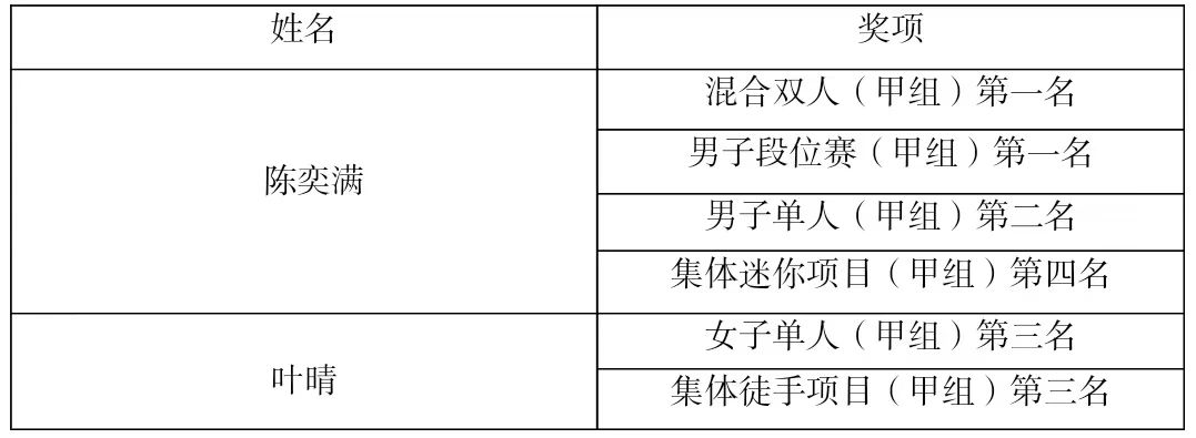 赛场上,参赛队员严格遵守比赛规则,准备充分,体式规范标准,展现了高超的技术水平及良好的素养。经过三天激烈的角逐,williamhill英国官网22计科9班陈奕满包揽了混合双人(甲组)第一名、男子段位赛(甲组)第一名、男子单人(甲组)第二名、集体迷你项目(甲组)第四名。23数媒技术6班叶晴分别斩获女子单人(甲组)第三名、集体徒手项目(甲组)第三名。