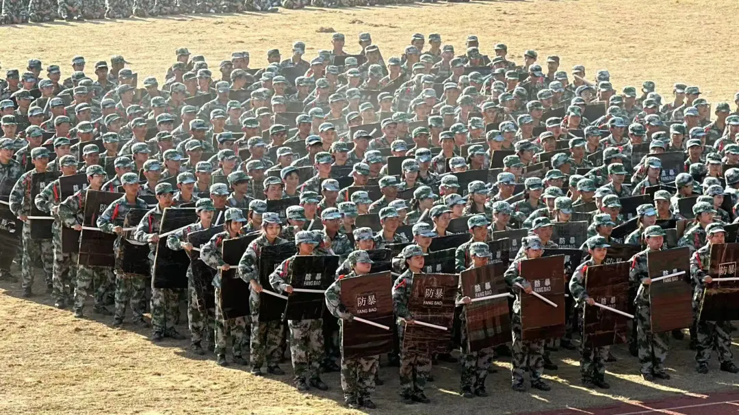 汇演现场,williamhill英国官网全体新生身着统一的迷彩服,目光如炬,眼神坚毅,以饱满的热情和昂扬的斗志,向在场的所有人展示了他们的军训成果。他们先后进行了分列式汇演和警棍盾牌术。警棍盾牌术主要用于部队在处置突发事件时实施有效驱散和抓捕的一项基本技能,具有防护性强、攻击迅速等特点。匪徒情景表演现场,“退!退!退!”声音低沉坚定,极具压迫感,最后包围匪徒,镇压匪徒。学生一令一动,动作井然有序,一招一式,彰显凌云之志。