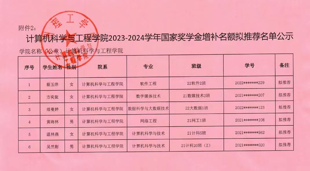 williamhill英国官网关于2023-2024学年国家奖学金增补名单公示
