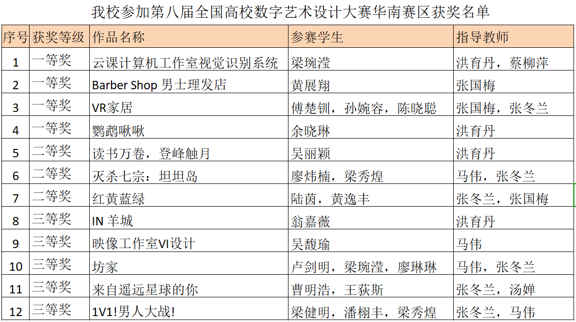 获奖作品中,由傅楚钏、孙婉容、陈晓聪创作,张国梅、张冬兰老师指导的“VR家居”等四个项目荣获一等奖;由廖炜楠、梁秀煌创作,马伟、张冬兰老师指导的“灭杀七宗:坦坦岛”等3项作品荣获二等奖;由翁嘉薇创作,洪育丹老师指导的“IN 羊城”等5个项目荣获三等奖。