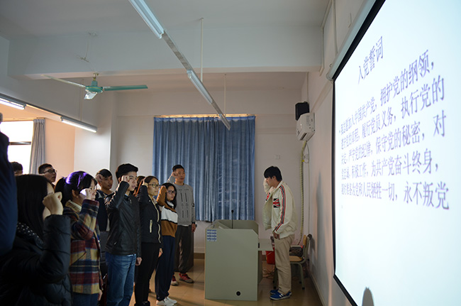 大会开始,首先由组织委员许俊对此次会议作简要介绍。11名发展对象逐一向党组织汇报近期自身各方面的转变和提升和检讨自身的不足之处。11名发展对象讲述了自己在党课培训和日常学习生活中的成长和收获,更加坚定了对党的追求,忠诚不变,强烈渴望以党员的身份为党所用、为人民服务,表示坚定不移跟着党走,充分说明了自己已经从思想、行动等各方面做好了成为一名预备党员的准备。随后,入党介绍人分别对11名发展对象近期的转变作出了客观、公正的评价,表示愿意介绍他们加入中国共产党。接着拥有表决权的党员同志采取无记名投票方式对11名发展对象进行表决,11名同志均通过投票成为中共预备党员。接着,学生党支部书记何祉谕对这11名同志加入党组织表示祝贺,并对他们提出要求,要求他们严格遵守党纪,争取早日成为一名真正的中共党员。