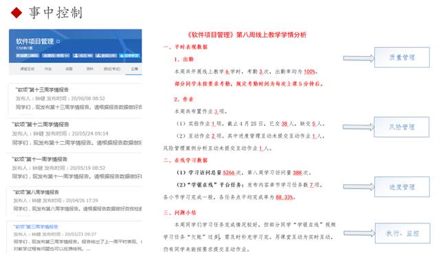 钟健老师的教学通过有效创设“线上教学”的各类项目情境,运用项目管理的专业知识设计、开展教学过程,整个环节都贯穿融合了课程的专业知识。学生在学习的同时,本身就处于“线上教学”这个项目中,再利用课程知识“管理”自己的学习,达到了“学以致用、用以促学、学用相长”目的,取得了较好的教学效果。