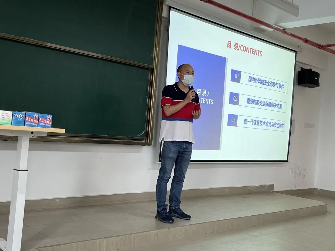 石老师围绕国内外网络安全态势与事件,重要事件安全保障解决方案以及新一代信息技术应用与安全防护三个主题进行展开,通过等级保护、云计算安全、大数据应用与量子安全应用等场景,结合案剖析,从行业和企业的角度出发,对新一代信息技术对信息产业发展的推动进行了详细的介绍,让学生们对各种安全场景有了认知,当威胁来临的时候,就有了基本的防范意识和针对性的对策与措施。