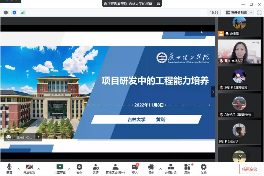 (通讯员:赵玉刚)11月8日,计算机科学与技术系邀请了吉林大学计算机学院黄岚教授,为学生们开展了一场以“项目研发中的能力培养”为主题的学术讲座。计算机科学与技术系的系全体老师以及计算机科学与技术专业1870多名学生采用线上线下相结合的方式聆听了讲座。