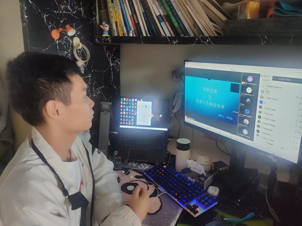 分享上,罗煜伟围绕“竞技双修和工作体验”进行分享。他先简单介绍大学的各类竞赛及目的,参加各类竞赛不仅可以转换学分、提升自身的能力、获得荣誉和奖金,更能在毕业后丰富简历,为进入社会奠定基石;随后分享他以前参加竞赛的思路,如何撰写竞赛论文以及注意事项;最后分享大数据专业的社会就业工作,实习面试所面临问题、职场与学校的不同以及注意的人际关系处理等。