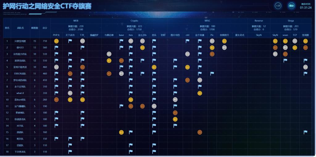 比赛吸引了计算机学院不同专业的63支队伍189名同学报名参加。经过初赛,筛选出25支队伍进入决赛。决赛试题以培养学生的实际动手能力为主,覆盖信息安全多个方面,包括杂项、逆向工程、图片隐写、流量分析、密码破解、web安全、漏洞挖掘与利用等21道题目。经过三个多小时的激烈比拼,评委根据竞赛平台的答题积分进行公平、公开评选,最终产生了一等奖2支队伍,二等奖3支队伍,三等奖5支队伍,优胜奖8支队伍。一二三等奖的参赛队伍分别获得500元、300、 100元的奖金。