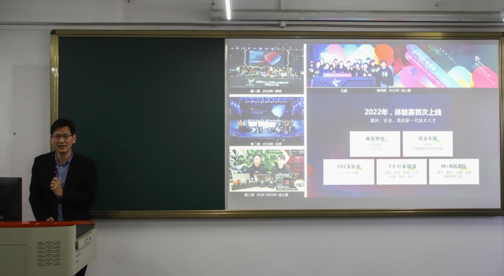 比赛结束后,学院特别邀请了北京长亭科技有限公司解决方案专家吴国旸老师就《网络安全人才需求分析》作了专题发言。他鼓励我们的学生走出课堂,走进实战,努力提升自己的就业优势。