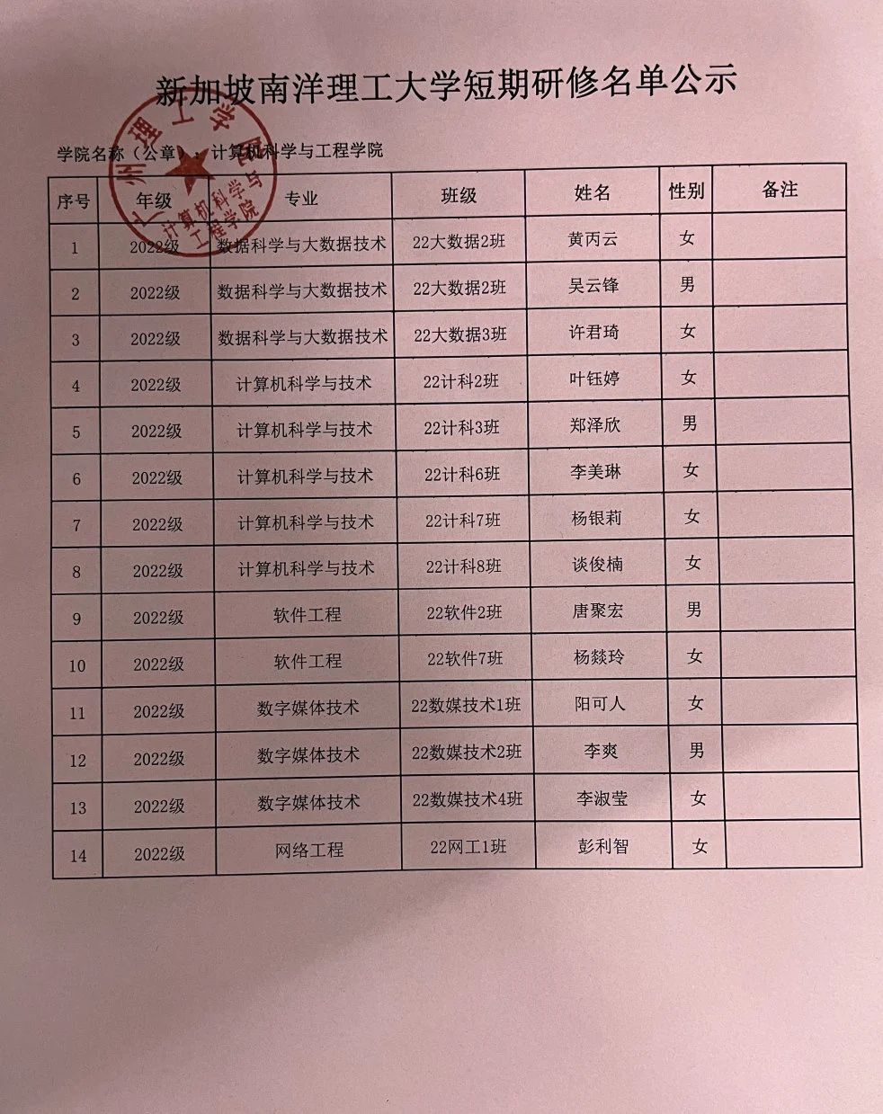 根据学校《关于选派优秀学生赴新加坡南洋理工大学短期研修的通知》的文件精神,“学生个人申请,二级学院审核推荐,按照公平、公开、公正的原则”,现将评比结果予以公示,公示期为2023年10月24日至2023年10月26日。若对公示有异议,请以书面形式向以下受理部门反映,反映情况时请签署真实姓名和联系电话,不签署真实姓名或不提供具体事实材料的,将不予受理。