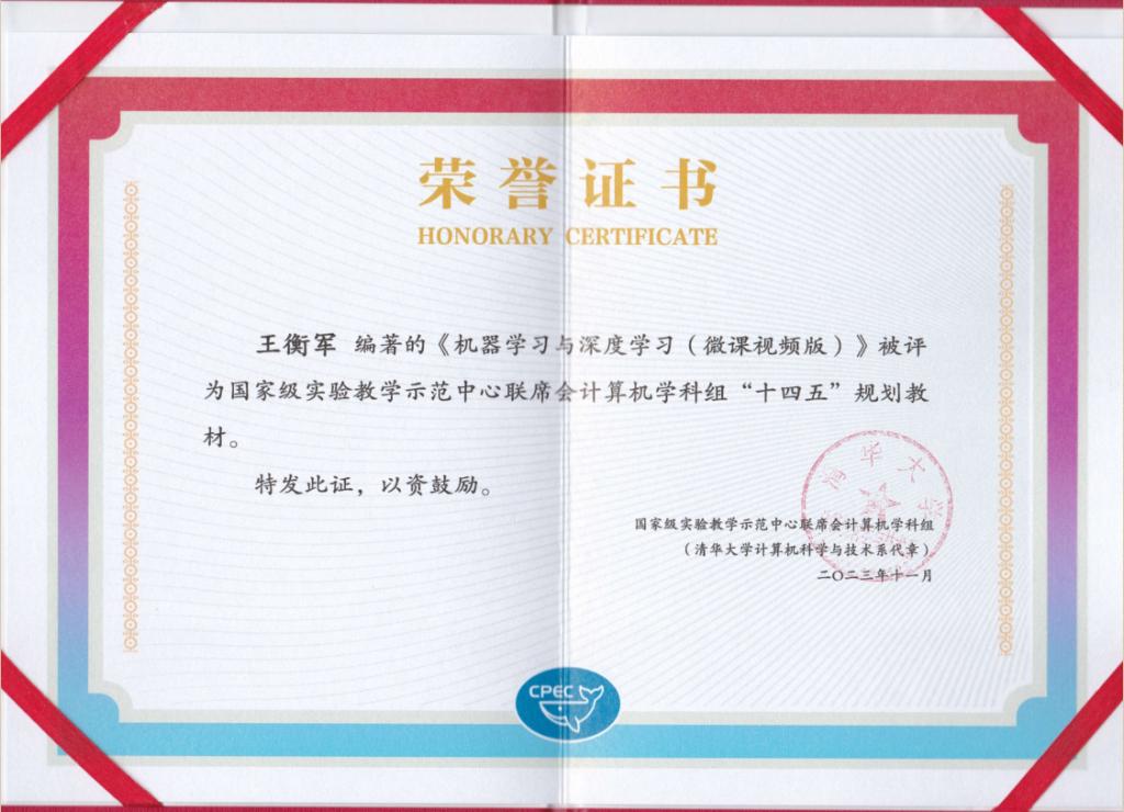 本次会议的主题是“人工智能实践实验教育创新”。williamhill英国官网王衡军老师所著的《机器学习(Python+sklearn+TensorFlow 2.0微课视频版》和《机器学习与深度学习(微课视频版)》自出版以来,已多次加印,被近百所高校采用作为教材,此次被评为国家级实验教学示范中心联席会计算机学科组“十四五”规划教材建设课题。王衡军老师受邀参加了此次会议,并领取了荣誉证书。