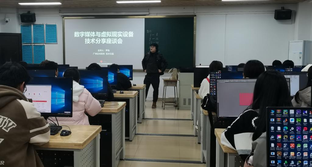 活动当天,学生们按照集合地点的指引有序出发,首先参观的是校史馆,馆内展示了学校的发展历程、优秀校友事迹以及学术成果,通过参观校史馆,学生们深刻了解到了学校的底蕴和荣誉。学生们在信息楼6楼的实验室里切身体验了其中的一些实验项目,企业工程师和校内学长学姐对动作捕捉设备进行了演示讲解,并为大家介绍了数字人技术的应用。在虚拟现实交互开发测试实验室内,23级的学生们戴上头盔并拿起手柄,体验了师兄师姐开发的 VR和 AR项目。这些项目以游戏为载体,让学生们在真实的环境中感受虚拟现实设备带来的沉浸感,随后,同学们一行聆听了广州口可公司技术总监尹海主讲的“数字媒体与虚拟现实设备技术分享会”。尹海作为广州口可软件科技有限公司的技术总监,具备丰富的经验和知识,能够给学生们带来宝贵的见解和启发。此次讲座内容丰富、覆盖面广,内容涵盖了数字媒体技术在推动虚拟现实发展中的重要作用,学生们认真聆听,并积极提问与尹总进行互动交流。会后学生们纷纷表示,通过尹总的讲座,他们对虚拟现实有了更深入的认识,并对将来在该领域的学习和研究充满了激情与期待。