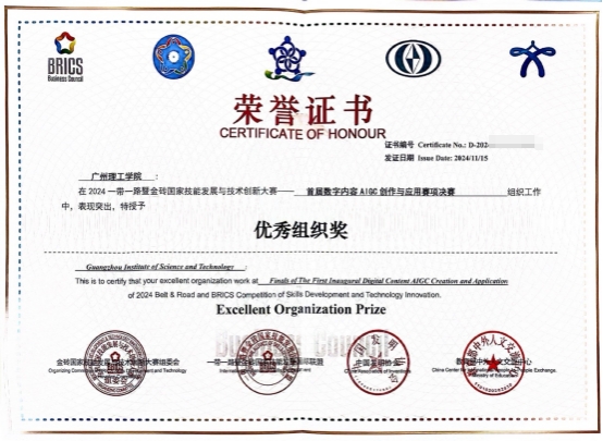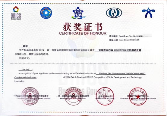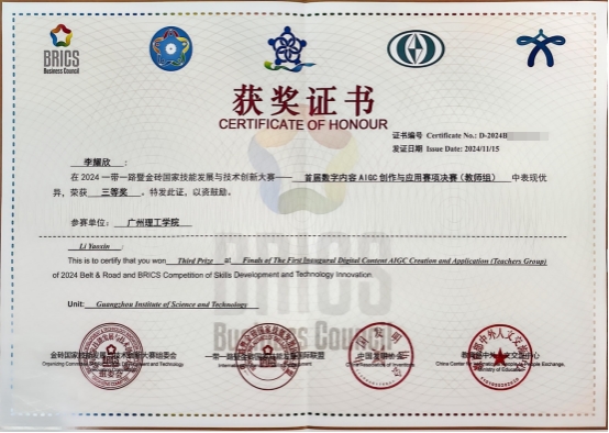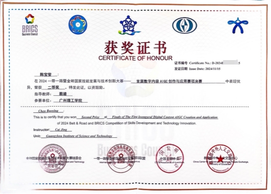 (李耀欣 蔡靖)近日,2024“一带一路”暨金砖国家技能发展与技术创新大赛首届数字内容AIGC创作与应用赛项总决赛圆满落幕,我校师生参赛团队表现出色,斩获(高职组和应用本科)多项殊荣,充分展现了学校在人工智能生成内容(AIGC)领域的实践与创新能力。其中,22数媒技术5班陈宝莹同学斩获了学生组全国二等奖,蔡靖老师荣获“优秀指导教师奖”,李耀欣老师荣获教师组全国三等奖,williamhill英国官网获得“优秀组织奖”。