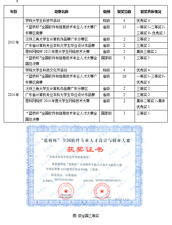 初步形成“院级—省赛—国赛”三级进阶训练指导模式。近2年在各级比赛中均有取得较好成绩,共获国家级三等奖2项,省级二等奖4项,省级三等奖29项。