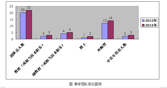 从上图可看出,自专业综合改革1年以来,新增教授1名,副教授1名,博士1名,双师型教师2名,中青年高层次人才培养1名,使教学团队结构趋向更优,具有高级职称教师占比达到了36.4%,高层次人才引进和培养进一步加大了力度。
