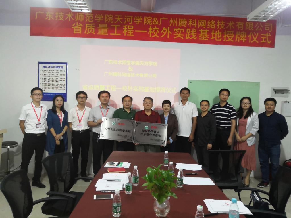 (通讯员 陈星莹)10月25日下午,广东技术师范学院天河学院计算机学院主持的省级质量工程项目校外实践基地揭牌仪式在腾科公司隆重举行。广州腾科网络技术有限公司总经理唐慧、职业发展部总监曾小媚、软件教学部的总监方少群、高校事业部渠道经理洪攀等代表公司出席;我校科研处张世梅处长、计算机学院原峰山院长、党总支刘亮书记、谌颃副院长、网络工程系主任王煜林等院领导班子成员代表校方一起出席了授牌仪式。
