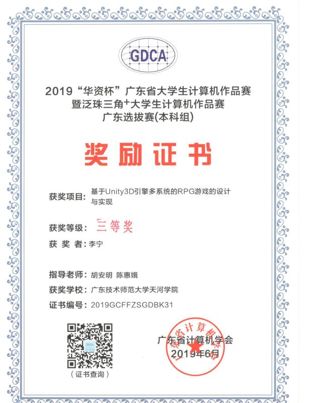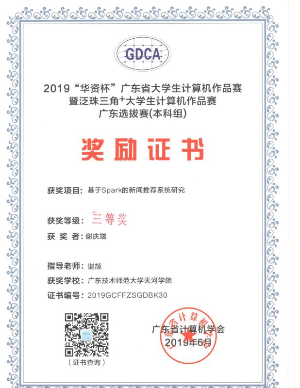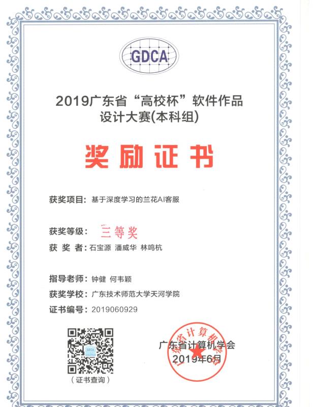 三项作品分别是谢庆端的《基于Spark的新闻推荐系统研究》(谌颃老师指导),李宁的《基于Unity3D引擎多系统的RPG游戏的设计与实现》(胡安明、陈惠娥老师指导),石宝源、潘威华、林鸣杭的《基于深度学习的兰花AI客服》(钟健、何韦颖老师指导)。