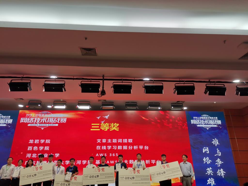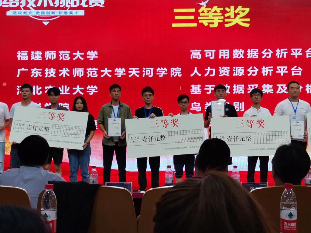 比赛分为区域赛与总决赛。经过大家的努力,我校计算机学院学生在前期华南区域赛中有10组同学参加,有7组同学取得了不错成绩,分别获得一等奖1项、二等奖3项、三等奖3项。从区域赛中脱颖而出的前2组同学晋级国赛。最终,由王金恒、田桂丰老师指导的16级网工班尤浩光、马鸿辉、谭振宇三位同学所在小组,由陈易平、王煜林老师指导的16级网工班吴木胜、李才森、陈敏标、蔡芷源四位同学所在小组获得了全国总决赛三等奖。