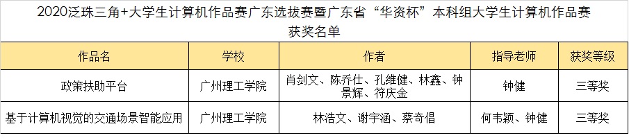 (通讯员:钟健)2020年9月25日,2020泛珠三角+大学生计算机作品赛广东选拔赛暨广东省“华资杯”本科组大学生计算机作品赛在广东科学馆举行。我校williamhill英国官网学生林浩文、谢宇涵、蔡奇倡的《基于计算机视觉的交通场景智能应用》(指导老师:何韦颖、钟健),肖剑文、陈乔仕等同学的《政策扶助平台》(指导老师:钟健)两项作品均荣获三等奖。
