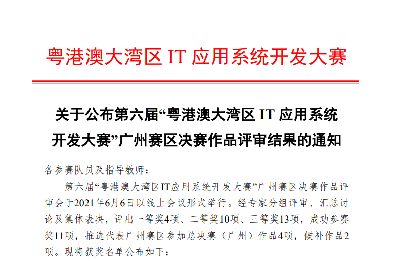 “粤港澳大湾区IT应用系统开发大赛”为做好本届大赛准备工作,在学院领导的支持下,指导老师和参赛学生积极备赛。大赛命题发布后,同学们就开始积极调研、分析赛题需求,根据专业技术特长组队,在老师指导下研究学习相关前沿技术,并进行了2个多月的集中开发,最后向组委会提交了参赛作品。经专家评审,评出了前三等奖的作品27项,我校参赛队伍首次参赛斩获省三等奖。
