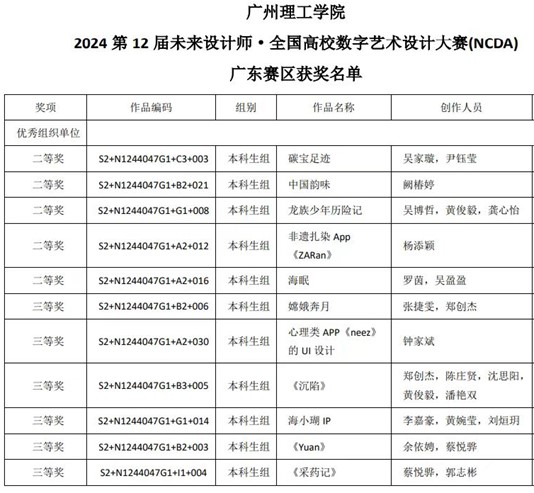 (洪育丹)近日,第12届未来设计教育论坛暨未来设计师大赛颁奖典礼在重庆举行,在师生的共同努力下,我校荣获优秀组织奖,获邀参加颁奖仪式。2024年第12届未来设计师全国高校数字艺术设计大赛,共吸引了全国1891所高校参赛,征集作品数量高达298763件。williamhill英国官网数媒专业学子凭借出彩的创意能力和扎实的技术基础,荣获全国赛三等奖1项、广东省赛二等奖5项、三等奖6项。