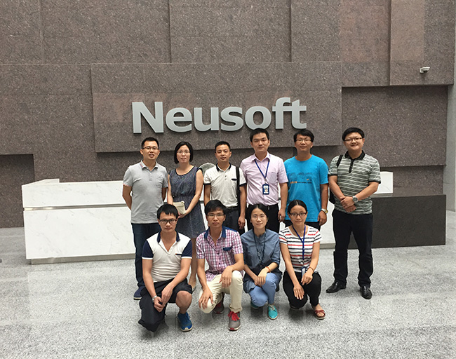 随后,一行人再次来到位于广州科学城的东软睿道公司看望在此实习的2013级计算机科学与技术专业在校学生,表达了学院领导对他们的关怀之情,并与公司相关负责进行了沟通交流。首先,东软睿道公司大学合作总监乐杰带领老师们参观了东软集团荣誉馆,了解了东软集团的各类型的产品系列。接着,谌颃副主任代表学院对实习单位给学生提供实践锻炼平台,在工作、学习、生活上给予学生无微不至的关怀表示感谢。乐杰总监也对学生在实习中的表现给予了高度评价。最后,双方针对本次实习生的实习时间安排以及学生住宿事项等问题做出了初步的商定。