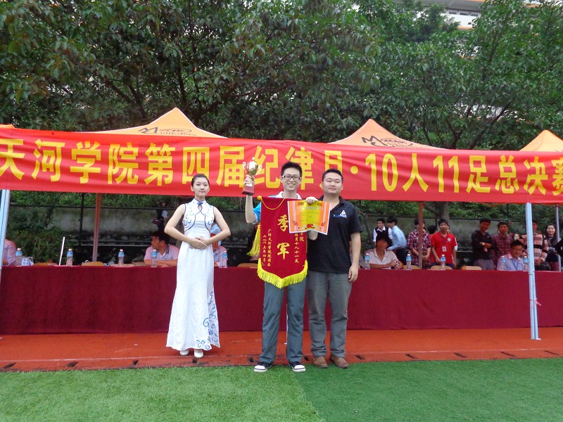 2013年4月23日下午4点30分,由院团委·学生会主办广师天河学院第四届纪律月“十人十一足”在新足球场隆重举行。我系代表队苍穹队和傲视队分别荣获亚军和季军,我系党总支书记刘元俊及院团委书记蔡小锋给其颁发了奖状。