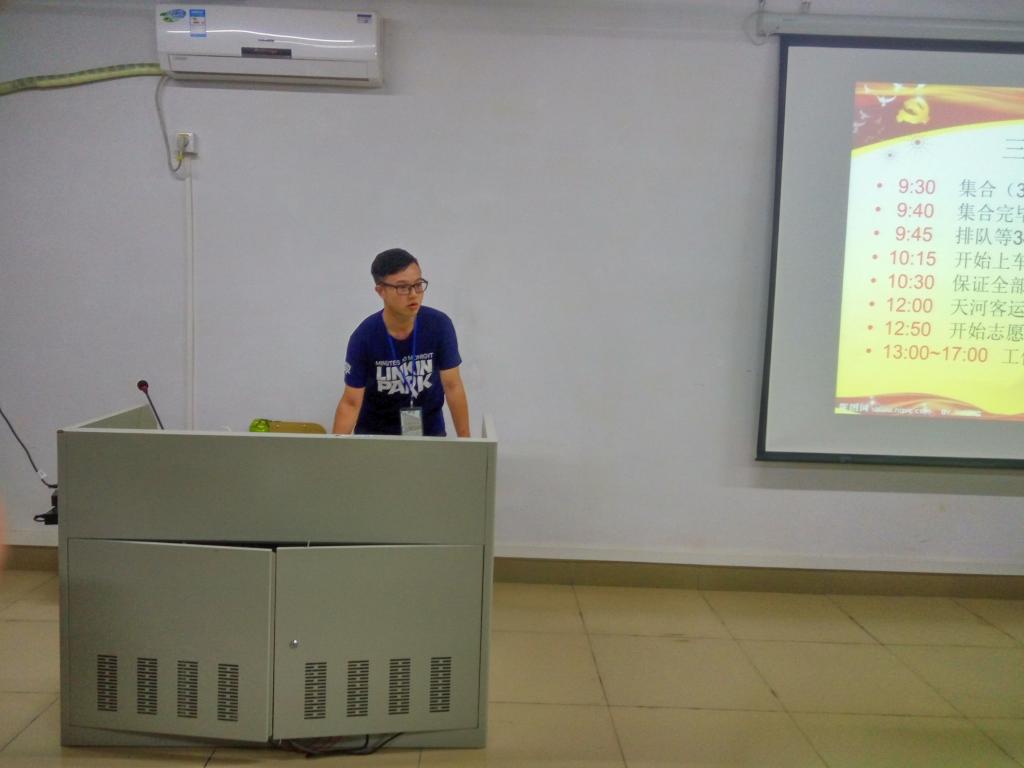 大会开始,首先由主持人柯鹏擎宣布到会情况,接着由罗芳芳宣读本次活动主要的工作内容以及各地铁站的人员分配等相关细节问题,再由建筑工程学院学生第三党支部联络人何炳锋解说本次活动的注意事项,最后主持人宣布本次动员大会圆满结束。