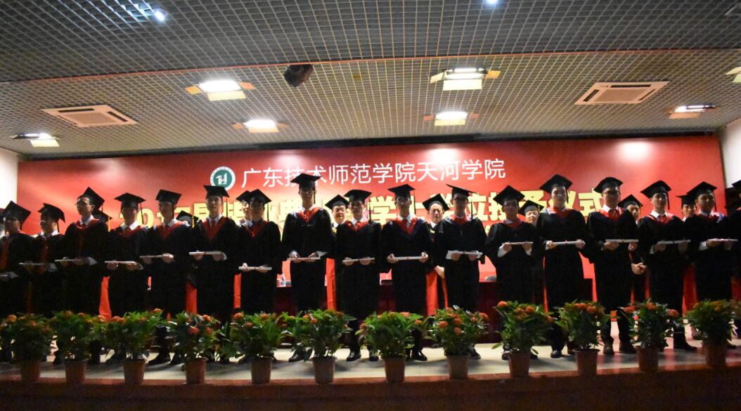 大会开始,全体起立,奏国歌。学院党总支袁颂皎书记宣读表彰优秀毕业生的决定。接着由毕业生代表向家长、教职工代表献花。由毕业生代表、计科132班的张轩源同学上台发言,他讲述了自己四年大学生活的收获和得到的成长,并代表毕业生向各位老师致以最衷心的感谢!再接着由教职工代表何韦颖发言,他表示,大学生活的结束意味着新开始,同学们要怀着信念努力拼搏奋斗,并常回天河学院这个家看看。最后由天河学院学位委员,信息与传媒学院董武绍教授致辞,他在简短表达了对同学们以后的祝福之后,宣读《学位授予决定》文件。此后学士学位授予仪式正式开始,同学们依次上台领取证书并合影留恋。
