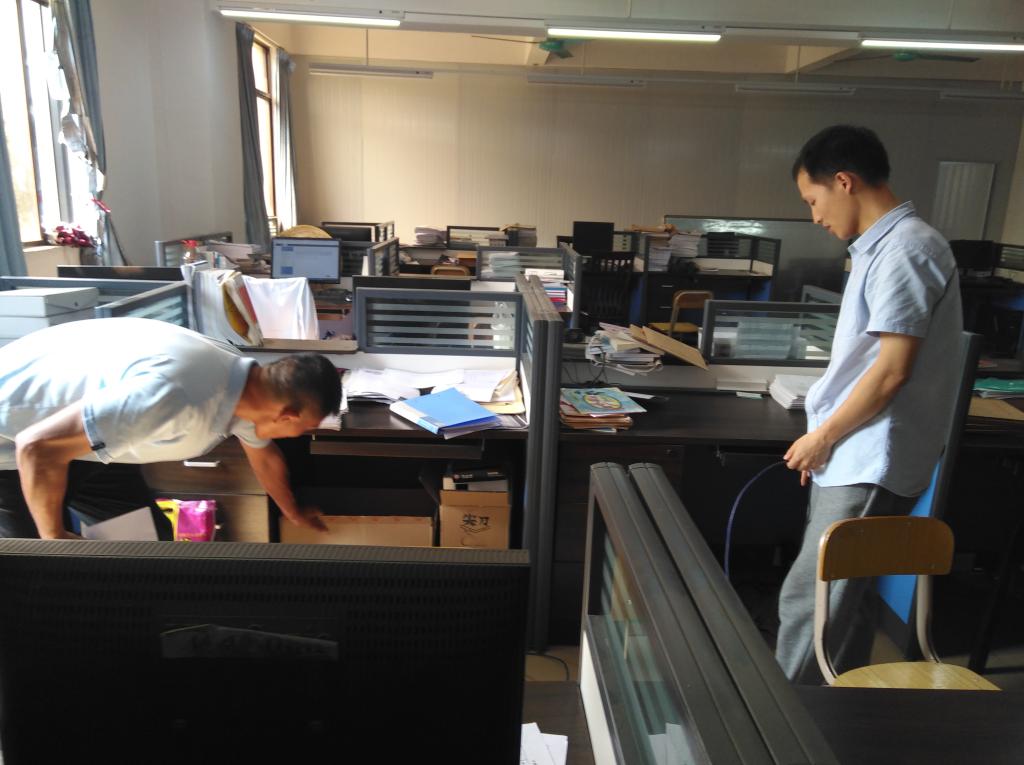 本次检查从11栋301办公室开始到608,消防小组成员认真检查了学院各个办公室和实验室的用电情况、灭火器安全情况,特别是电源排插附近有没有杂物堆积。经检查,大部分办公桌的电源连接都符合安全规范,实验室的安全管理尤其到位。但306工作室讲台电源附近有纸箱堆积,现场发现后马上进行了处理。另外,消防小组记录下3楼楼道的灭火器有效期到2018年6月,需及时更换,以便早日消除安全隐患。