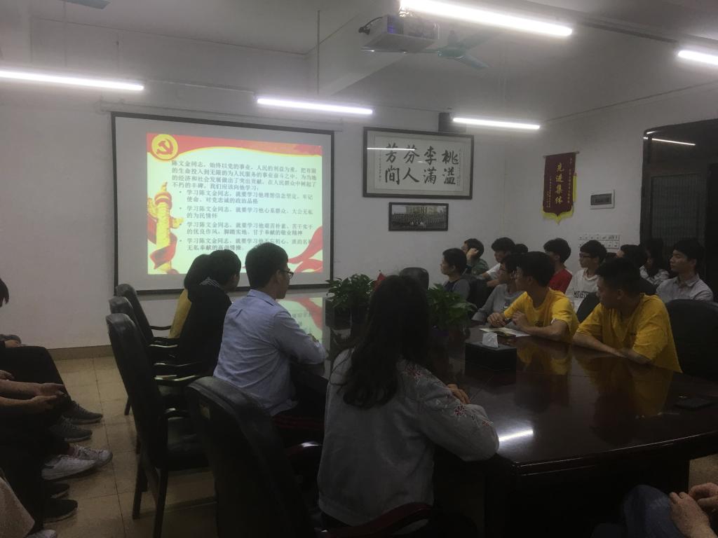 会议由范明娟主持召开。她详细介绍了陈文金同志生平事迹。作为我校毕业生中的优秀代表,陈文金心里时刻装着群众,牢记使命,敢于担当,坚守一线,是基层扶贫工作者的先进典型,是我校党员干部及全体师生学习的榜样。他的生命短暂而光辉,但他的示范带动作用却很有力。作为陈文金同志的校友,我们不仅感到自豪,更要用陈文金同志的感人事迹和高尚精神重塑自我,做新时代合格党员。