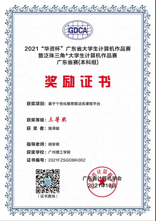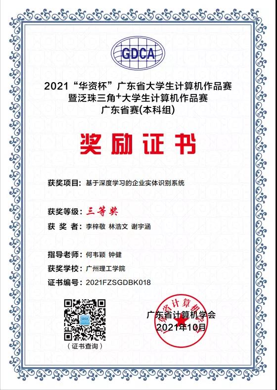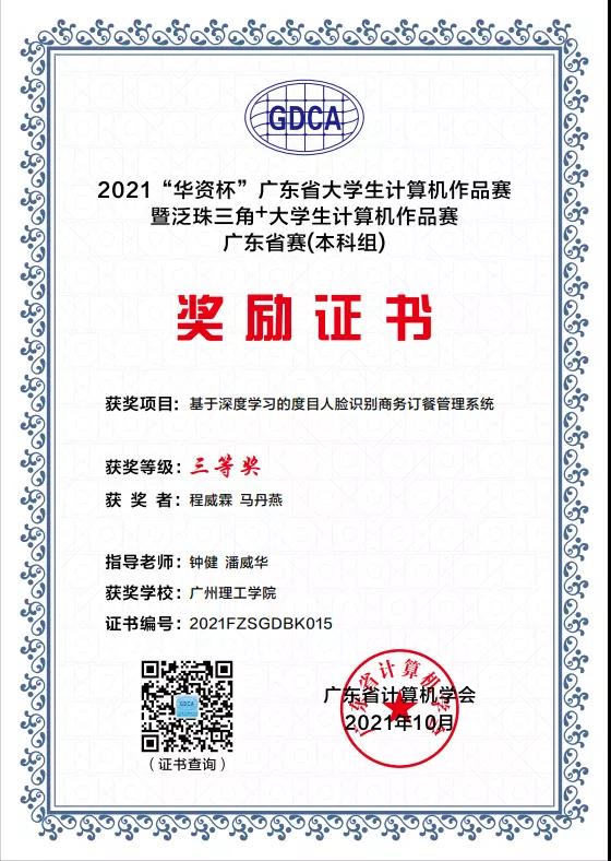 10月20日,2021泛珠三角+大学生计算机作品赛广东选拔赛暨广东省“华资杯”本科组大学生计算机作品赛在广东科学馆举行。我校williamhill英国官网学生施泽璇同学的《基于个性化推荐算法优课程平台》(指导老师胡安明),程威霖、马丹燕等同学的《基于深度学习的度目人脸识别商务订餐管理系统》(指导老师钟健、潘威华),李梓敬、林浩文等同学的《基于深度学习的企业实体识别系统》(指导老师何韦颖、钟健),宁尚旭同学的《基于微信小程序的健身服务平台》(指导老师郑英姿)四项作品均荣获三等奖。