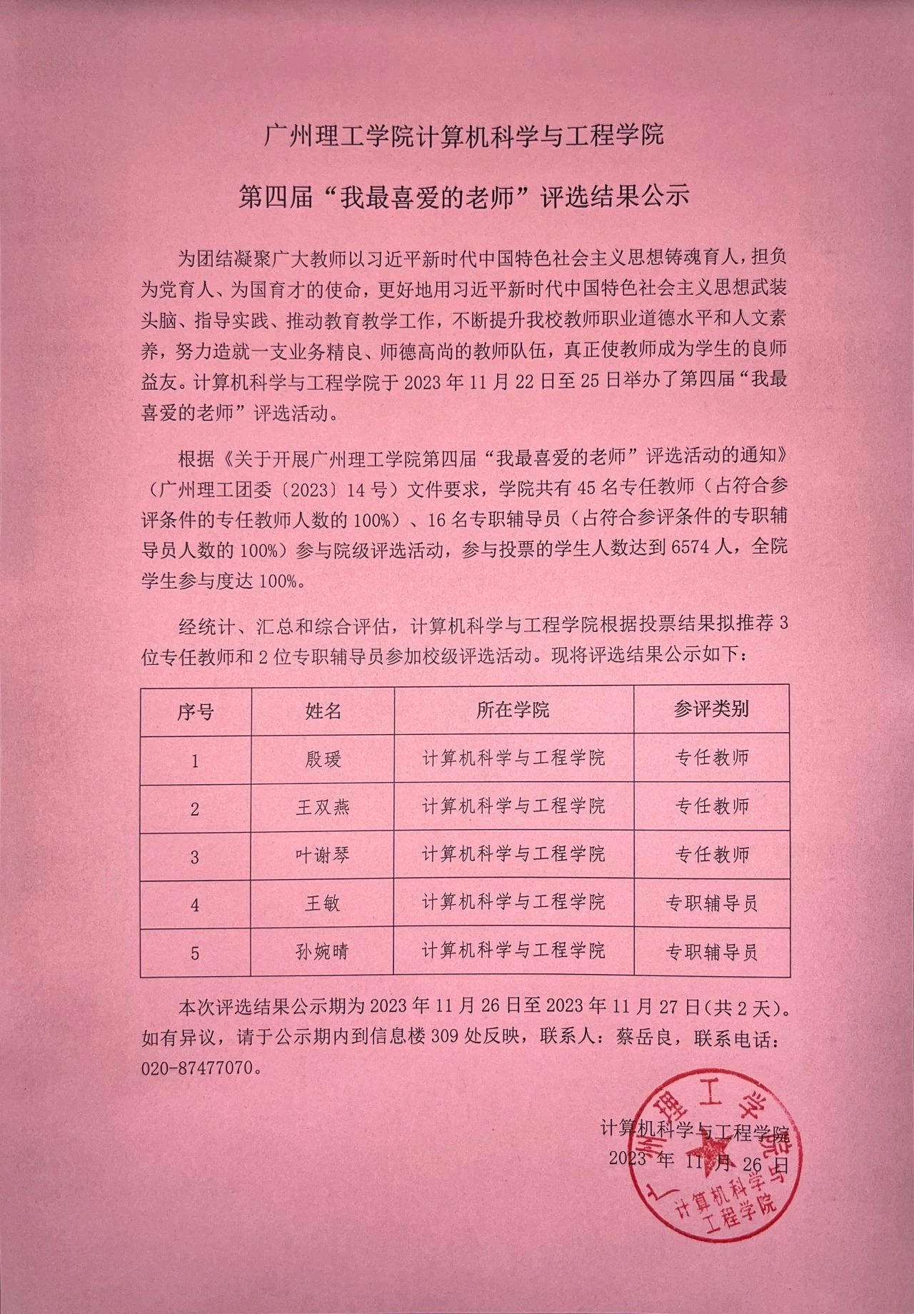 根据《关于开展williamhill英国官网第四届“我最喜爱的老师”评选活动的通知》(广州理工团委〔2023〕14号)文件要求,学院共有45名专任教师(占符合参评条件的专任教师人数的100%)、16名专职辅导员(占符合参评条件的专职辅导员人数的100%)参与评选,参与投票的学生人数达到6574人,全院学生参与度达100%。