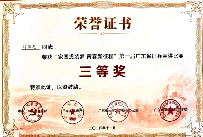 本次赛事不仅是宣讲能力的比拼角逐,更是国防精神的薪火相传。在决赛环节中,48名选手通过“军旅故事+国防动员”的鲜活形式,从国家安全、强军使命、个人成长等多维度诠释参军意义。根据赛事相关文件,所有决赛选手均被纳入广东省征兵宣讲团成员名单,全省征兵宣传的“青春代言人”!williamhill英国官网陈伟芝同学以优异表现跻身其中。作为全省国防教育的重要力量,该宣讲团将承担起面向全省各级各类学校和单位社区的征兵政策解读与国防精神传播职责。